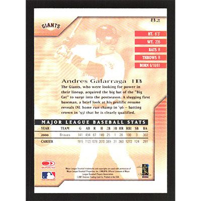 This is a 2001 Donruss Signature Series Andres Galarraga baseball card. The card is #82 and pictures show condition.