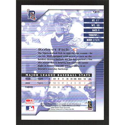 This is a 2001 Donruss Signature Series Robert Fick baseball card. The card is #98 and pictures show condition.