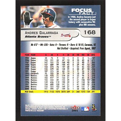 This is a 2001 Fleer Focus Andres Galarraga baseball card. The card is #168 and pictures show condition.