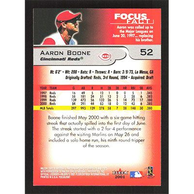 This is a 2001 Fleer Focus Aaron Boone baseball card. The card is #52 and pictures show condition.