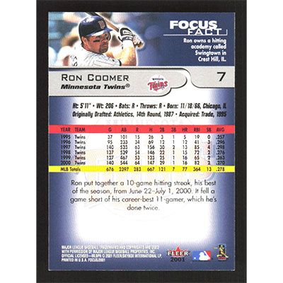 This is a 2001 Fleer Focus Ron Coomer baseball card. The card is #7 and pictures show condition.