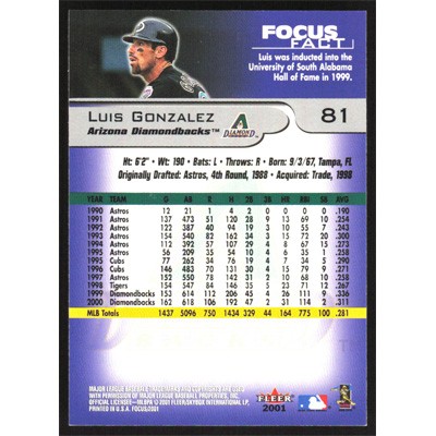 This is a 2001 Fleer Focus Luis Gonzalez baseball card. The card is #81 and pictures show condition.