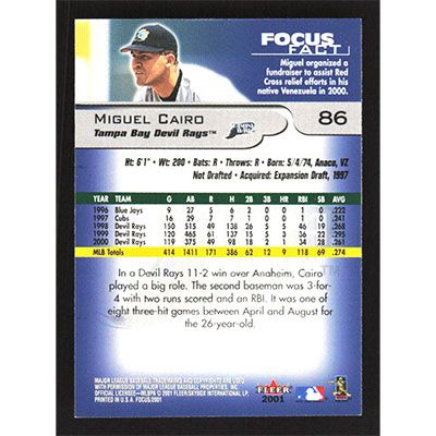 This is a 2001 Fleer Focus Miguel Cairo baseball card. The card is #86 and pictures show condition.