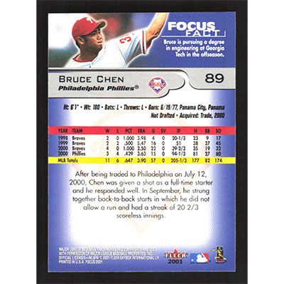 This is a 2001 Fleer Focus Bruce Chen baseball card. The card is #89 and pictures show condition.