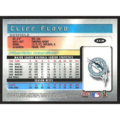 This is a 2001 Fleer Futures Cliff Floyd baseball card. The card is #113 and pictures show condition.