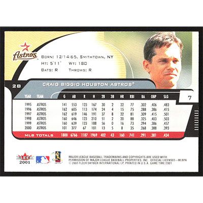 This is a 2001 Fleer Game Time Craig Biggio baseball card. The card is #7 and pictures show condition.
