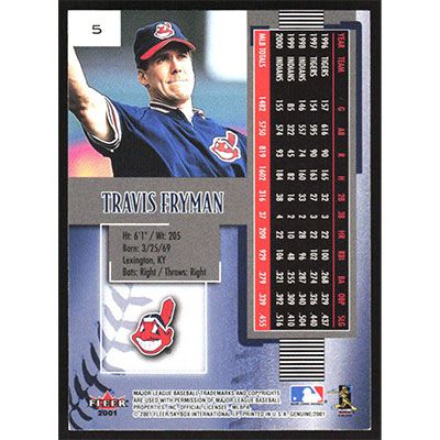 This is a 2001 Fleer Genuine Travis Fryman baseball card. The card is #5 and pictures show condition.
