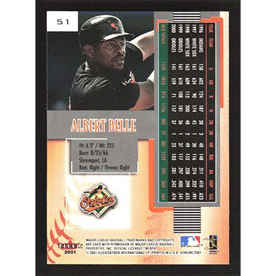 This is a 2001 Fleer Genuine Albert Belle baseball card. The card is #51 and pictures show condition.