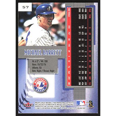 This is a 2001 Fleer Genuine Michael Barrett baseball card. The card is #57 and pictures show condition.