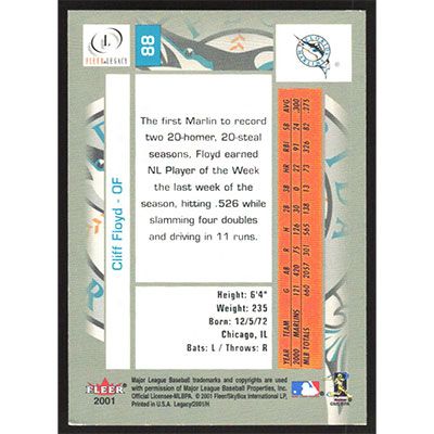 This is a 2001 Fleer Legacy Cliff Floyd baseball card. The card is #88 and pictures show condition.