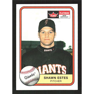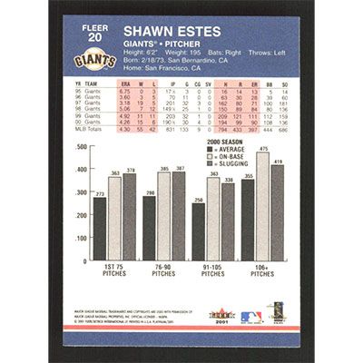 This is a 2001 Fleer Platinum Shawn Estes baseball card. The card is #20 and pictures show condition.