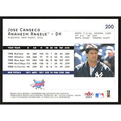 This is a 2001 Fleer Premium Jose Canseco baseball card. The card is #200 and pictures show condition.