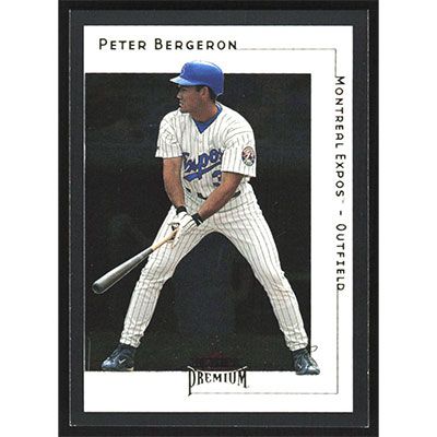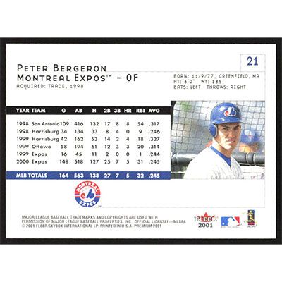 This is a 2001 Fleer Premium Peter Bergeron baseball card. The card is #21 and pictures show condition.