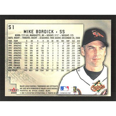This is a 2001 Fleer Showcase Mike Bordick baseball card. The card is #51 and pictures show condition.