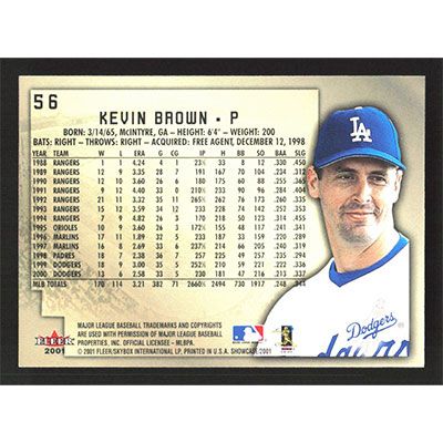 This is a 2001 Fleer Showcase Kevin Brown baseball card. The card is #56 and pictures show condition.