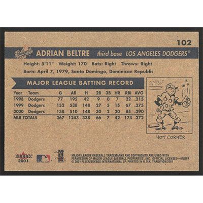 This is a 2001 Fleer Tradition Adrian Beltre baseball card. The card is #102 and pictures show condition.
