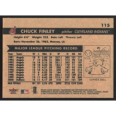 This is a 2001 Fleer Tradition Chuck Finley baseball card. The card is #115 and pictures show condition.