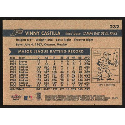 This is a 2001 Fleer Tradition Vinny Castilla baseball card. The card is #232 and pictures show condition.