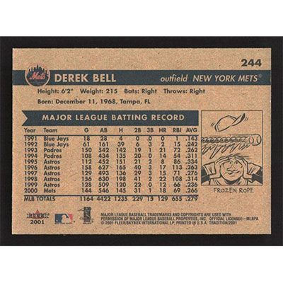 This is a 2001 Fleer Tradition Derek Bell baseball card. The card is #244 and pictures show condition.
