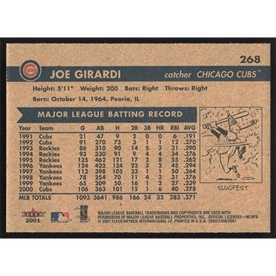 This is a 2001 Fleer Tradition Joe Girardi baseball card. The card is #268 and pictures show condition.