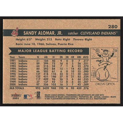This is a 2001 Fleer Tradition Sandy Alomar Jr. baseball card. The card is #280 and pictures show condition.