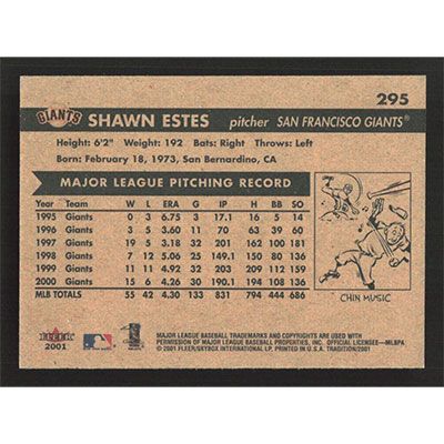 This is a 2001 Fleer Tradition Shawn Estes baseball card. The card is #295 and pictures show condition.