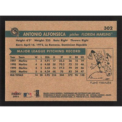 This is a 2001 Fleer Tradition Antonio Alfonseca baseball card. The card is #302 and pictures show condition.