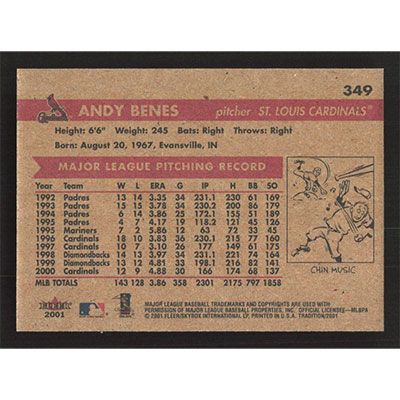 This is a 2001 Fleer Tradition Andy Benes baseball card. The card is #349 and pictures show condition.