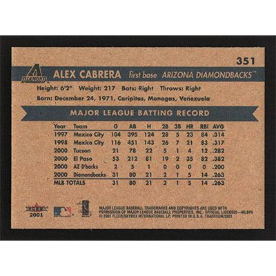 This is a 2001 Fleer Tradition Alex Cabrera baseball card. The card is #351 and pictures show condition.