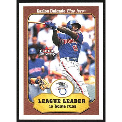 This is a 2001 Fleer Tradition Carlos Delgado League Leaders baseball card. The card is #398 and pictures show condition.