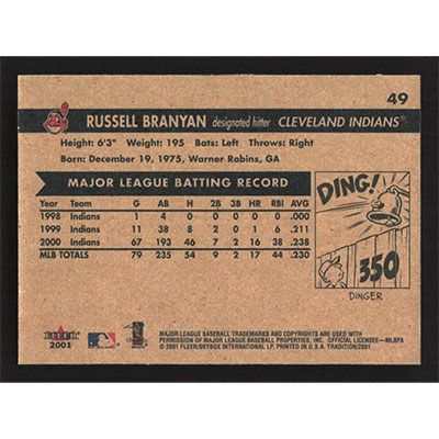 This is a 2001 Fleer Tradition Russell Branyan baseball card. The card is #49 and pictures show condition.