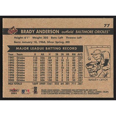This is a 2001 Fleer Tradition Brady Anderson baseball card. The card is #77 and pictures show condition.
