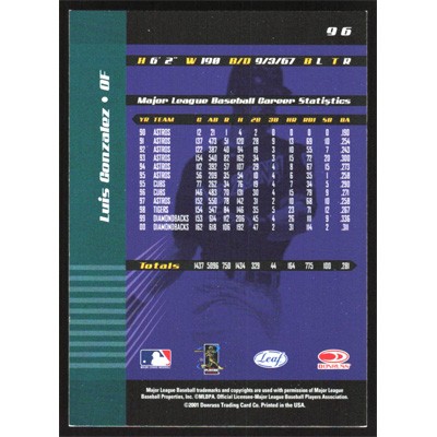 This is a 2001 Leaf Limited Luis Gonzalez baseball card. The card is #96 and pictures show condition.