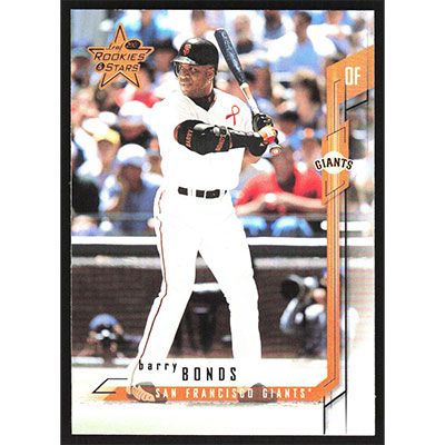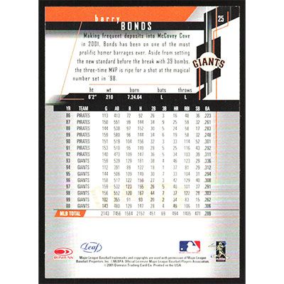 This is a 2001 Leaf Rookies & Stars Barry Bonds baseball card. The card is #25 and pictures show condition.