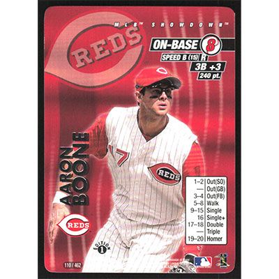 This is a 2001 MLB Showdown 1st Edition Aaron Boone baseball card. The card is #110 and pictures show condition.