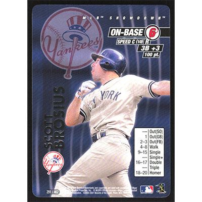 This is a 2001 MLB Showdown Unlimited Scott Brosius baseball card. The card is #291 and pictures show condition.