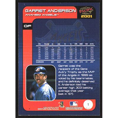This is a 2001 Pacific Garret Anderson baseball card. The card is #1 and pictures show condition.