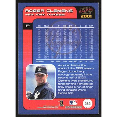 This is a 2001 Pacific Roger Clemens baseball card. The card is #283 and pictures show condition.