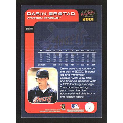 This is a 2001 Pacific Darin Erstad baseball card. The card is #3 and pictures show condition.