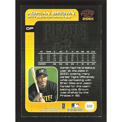 This is a 2001 Pacific Adrian Brown baseball card. The card is #332 and pictures show condition.