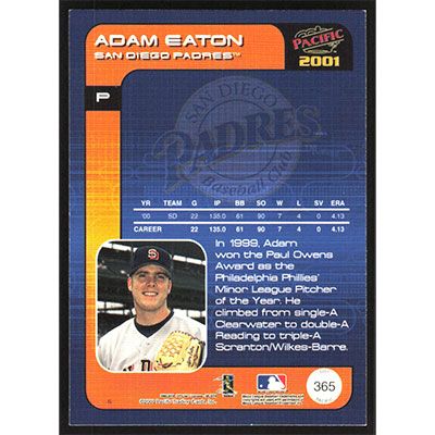 This is a 2001 Pacific Adam Eaton baseball card. The card is #365 and pictures show condition.
