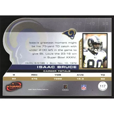 This is a 2001 Pacific Prism Atomic Isaac Bruce football card. The card is #117 and pictures show condition.