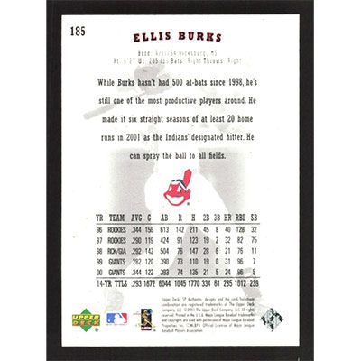 This is a 2001 SP Authentic Ellis Burks baseball card. The card is #185 and pictures show condition.
