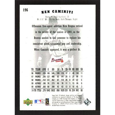 This is a 2001 SP Authentic Ken Caminiti baseball card. The card is #196 and pictures show condition.