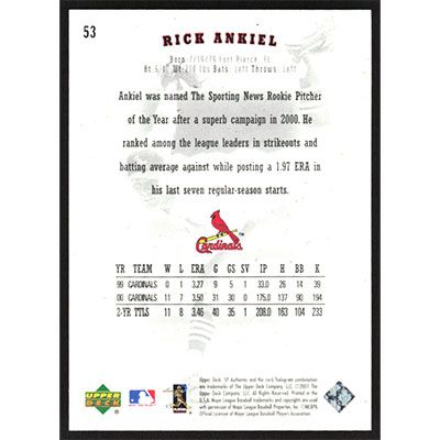 This is a 2001 SP Authentic Rick Ankiel baseball card. The card is #53 and pictures show condition.