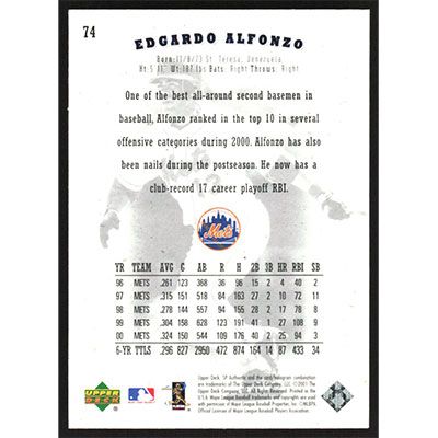 This is a 2001 SP Authentic Edgardo Alfonzo baseball card. The card is #74 and pictures show condition.