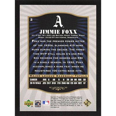 This is a 2001 SP Legendary Cuts Jimmie Foxx baseball card. The card is #2 and pictures show condition.