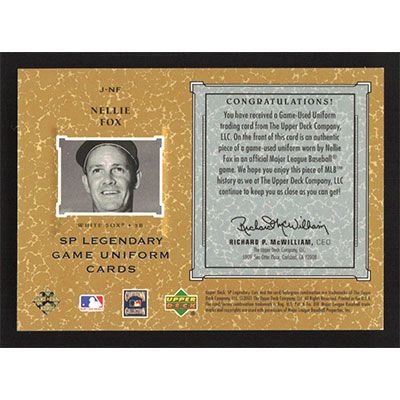 This is a 2001 SP Legendary Cuts Game Jersey Nellie Fox Jersey baseball card. The card is #J-NF and pictures show condition. Team(s): Chicago White Sox
