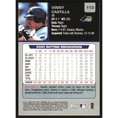 This is a 2001 Stadium Club Vinny Castilla baseball card. The card is #113 and pictures show condition.