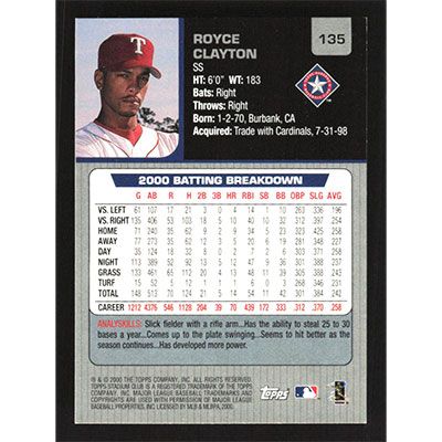 This is a 2001 Stadium Club Royce Clayton baseball card. The card is #135 and pictures show condition.